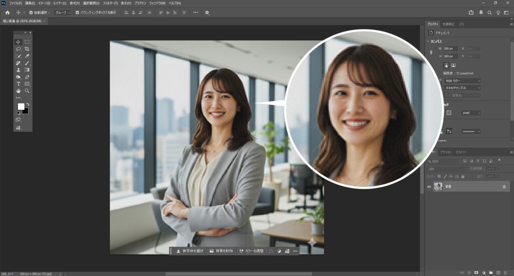 【 ※ 注意 ※ 】 生成アップスケールは Photoshop 2026(v27.0)以降 で使える新機能です。 それ以前のバージョンをお使いの場合は、メニューに表示されませんのでご注意ください。