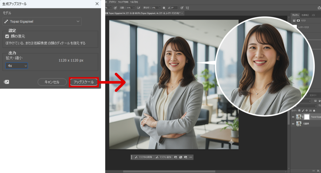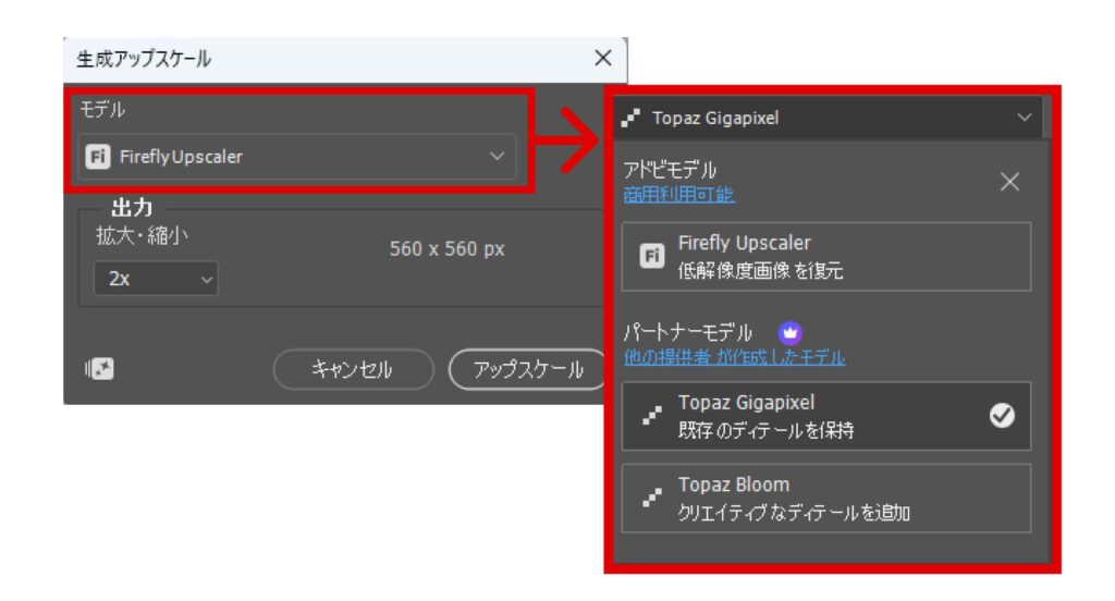 今回はかなり写真がぼやけてしまっていたため「Topaz Gigapixel」を選択、倍率は「×4」を選んで「アップスケール」を実行します。