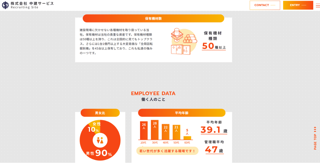 株式会社中建サービス様の採用サイトでは、事業規模を示すデータと社員の働く環境を示すデータが、バランスよく配置されています。