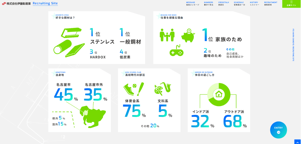 伊藤彰産業株式会社様は、名古屋を拠点に長年にわたり鋼材販売・加工を手がける企業です。採用サイトの「数字で見る」ページでは、「好きな鋼材は?」「仕事を頑張る理由は?」といった、業界色を活かしつつ社員の人柄が見える質問を取り入れています。