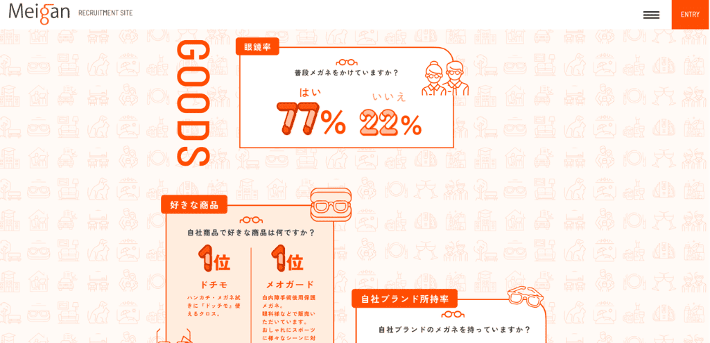 名古屋眼鏡株式会社様の採用サイトでは、一般的な社員構成データに加えて、「社員の眼鏡着用率」「好きな自社商品ランキング」「自社ブランドの眼鏡所持率」といった、眼鏡の卸売・企画販売を手がける同社ならではの項目を掲載しています。