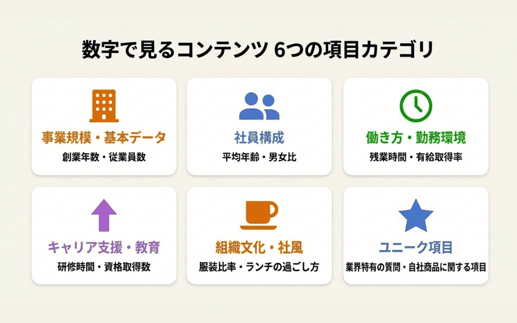 ここからは「数字で見る」コンテンツでよく使われる項目を6つのカテゴリに分けて紹介します。ぜひ、前章で整理した自社の採用課題に合わせて取捨選択してみてくださいね。