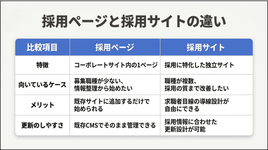 一方、採用サイトは、採用情報を中心に設計した独立性の高いサイトです。職種ごとの情報設計、社員インタビュー、選考の流れ、よくある質問などを、求職者の目線で探しやすく組み立てられるのが強みです。採用単価、ミスマッチ、応募の質など、改善したい課題がはっきりしているほど、採用サイトの設計が活きてきます。