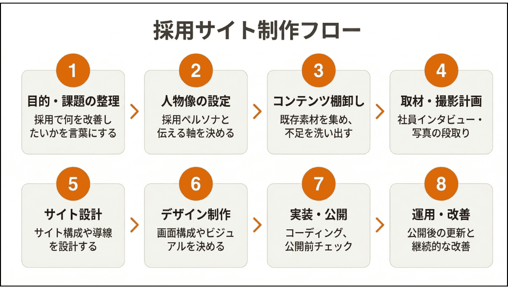 コーポレートサイトとの違いがはっきりしたところで、さっそく採用サイトの制作フローを見ていきましょう。