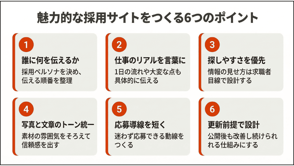 相手が知りたいことを先に出すほど、文章は伝わりやすくなります。採用サイトも同じで、読み手が迷わない順序をつくるのがコツです。
