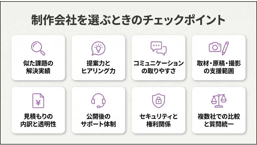- 制作会社は、実績だけでなく、課題の整理力、コンテンツ支援、公開後の運用まで含めて選ぶと安心