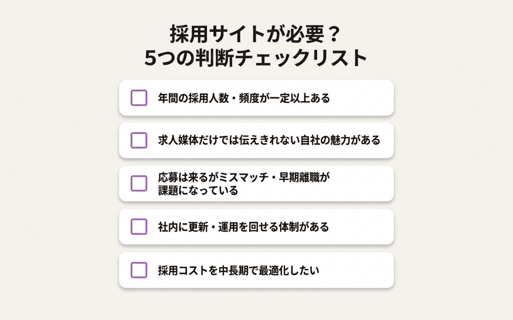 採用サイトの必要性は、企業の規模や採用頻度、課題の内容によって異なります。以下の5つの項目に当てはまるものが多いほど、採用サイトへの投資が効果を発揮しやすい傾向があります。自社の状況と照らし合わせながら確認してみてください。