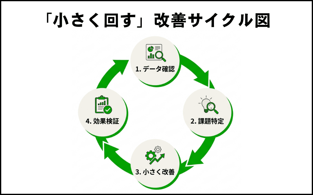 目標と確認すべき指標が決まったら、実際にデータを取得して改善に向けたサイクルを回していきます。一度に大きな改修を行うのではなく、現状の課題を把握し、少しずつ手を入れて反応を見るのが運用の基本です。