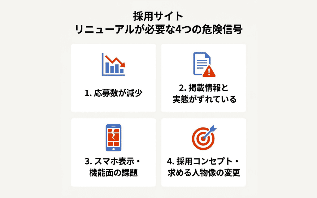 採用サイトの見直しを検討すべきタイミングは、大きく分けて4つの状況に整理できます。そしていずれも「サイトの中身」と「採用活動の現実」との間にずれが生じているという共通点があります。自社の状況と照らし合わせながら確認してみてください。