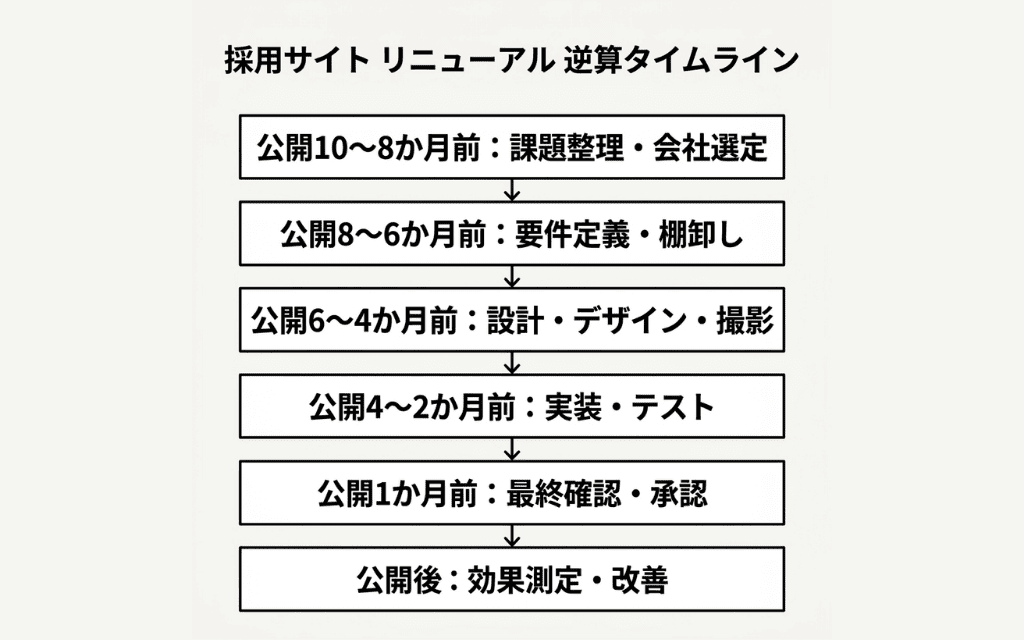 | 公開8〜10か月前 | 課題整理・制作会社選定 | 社内ヒアリング・RFP作成を含む |