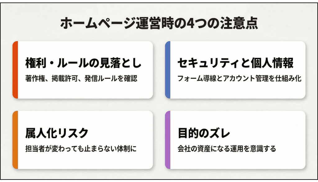 ホームページ運営で起きやすいのが、忙しさで更新が止まり、気付いたときには触りにくい状態になっていることです。ここは、気合いではなく仕組みで助けてあげるのが合っています。